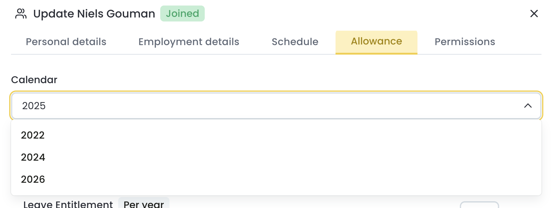 The allowances are shown for the current calendar. You can select a different calendar using the dropdown, or follow these instructions if you need to create a new calendar.