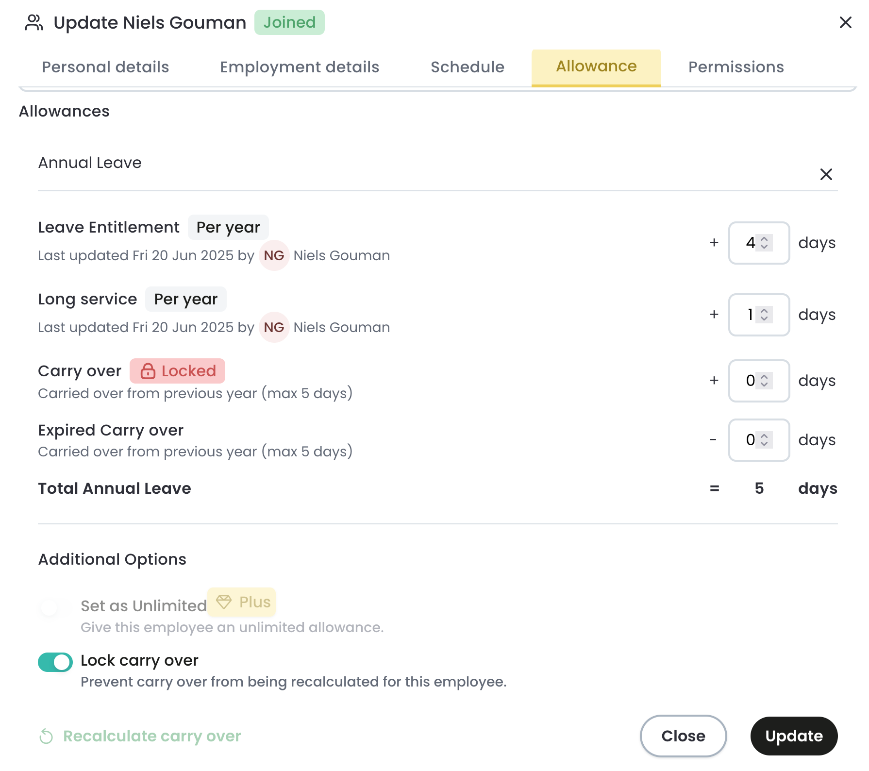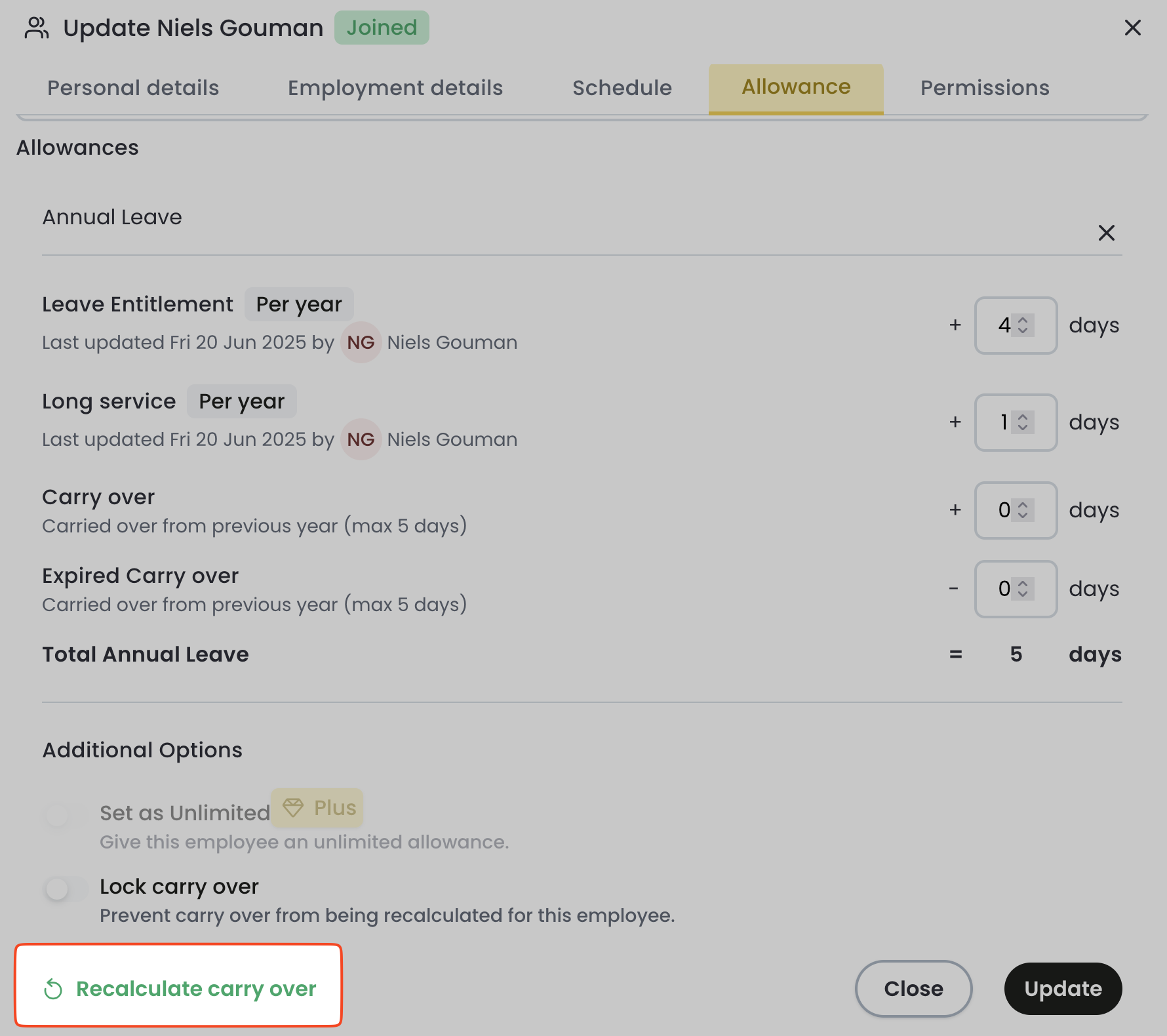 - To retrospectively perform the carry over calculation after the leave year has started.