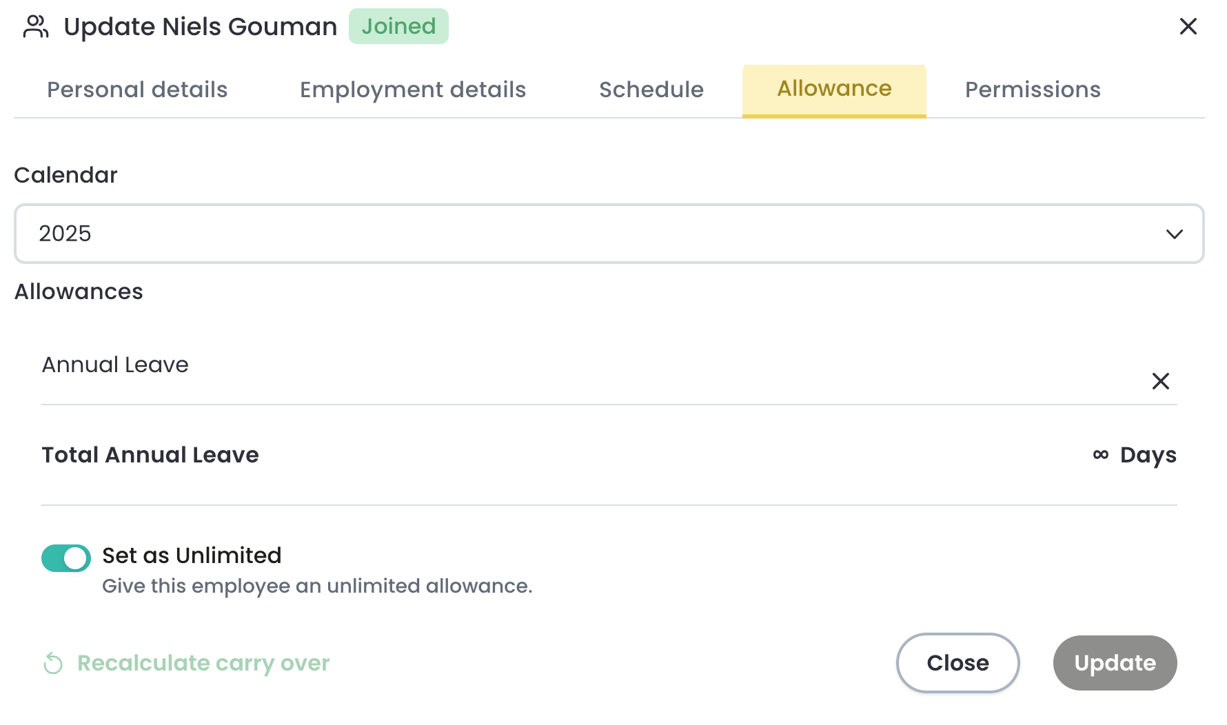If you wish to give someone an unlimited allowance, you can turn on the Set as unlimited toggle shown within the allowance. This removes the allowance, as shown below.
