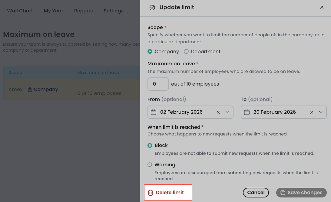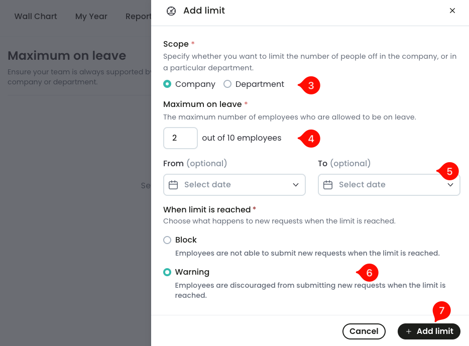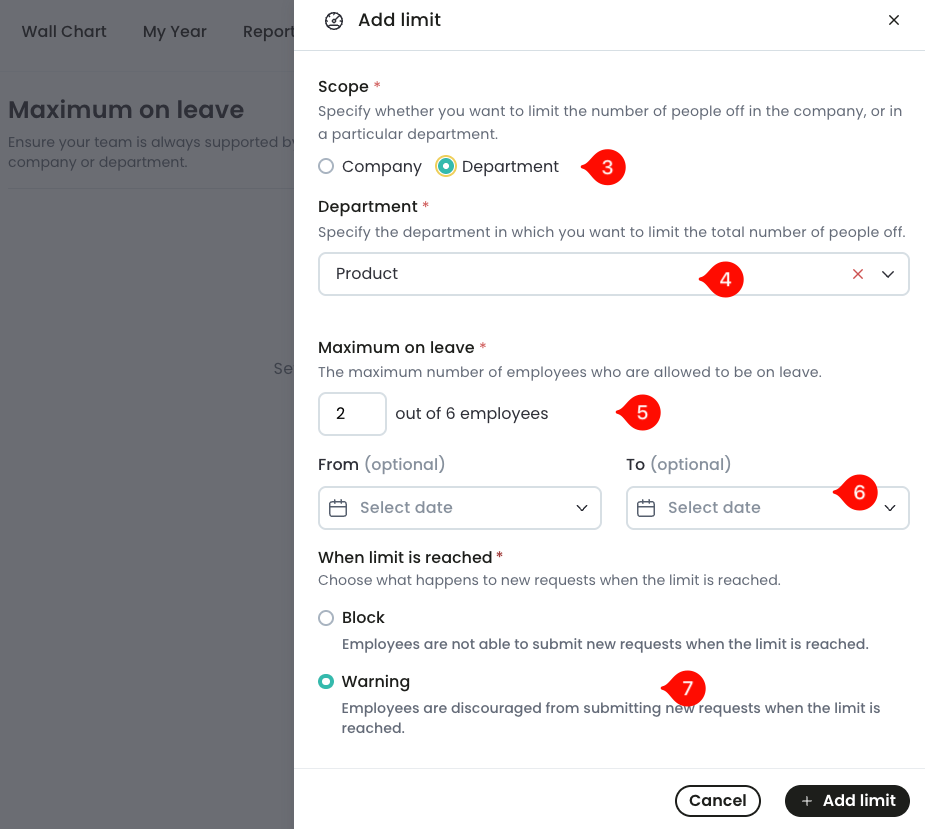 Leave limits enable you to ensure you have a functional team and that work does not slow or delay because multiple people have taken the same day off. With leave limits, you can set the maximum number of people who can take the same day off either in a certain department or across the company.