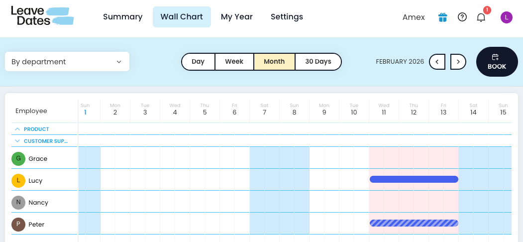 In the Wall chart, leave limits aren’t displayed unless they have been reached. When reached, leave limits are shown as faint red boxes over the dates for which the limit applies. Limits can either be shown for all employees or for employees in certain departments.