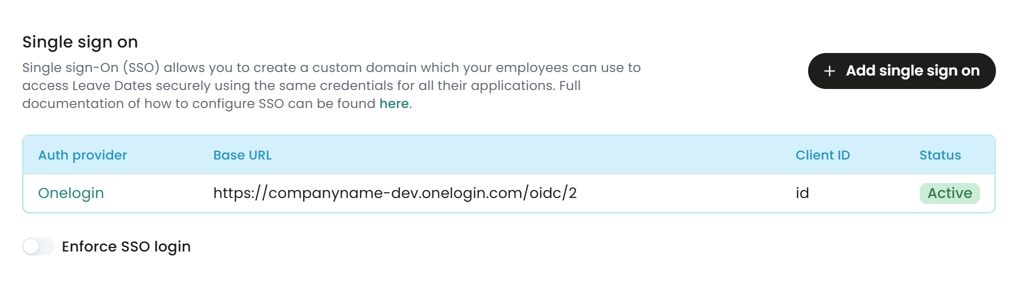 - Everything is now configured to allow you to log in to Leave Dates using OneLogin SSO.